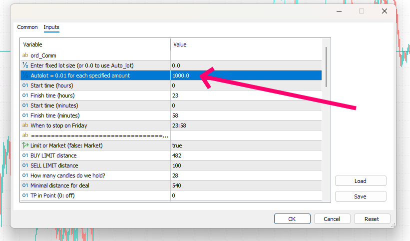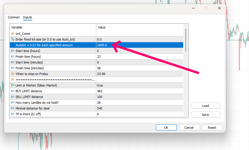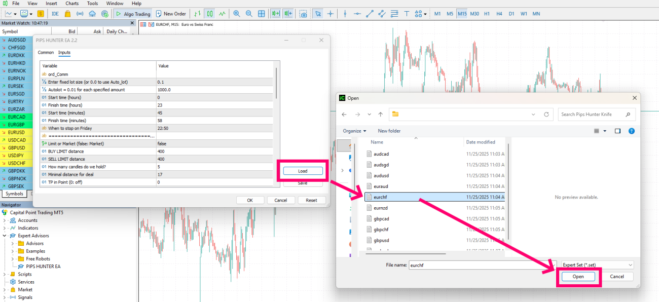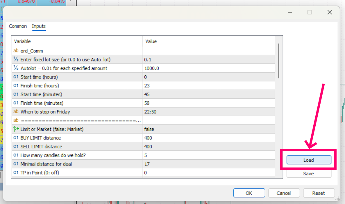 After attaching the EA to a chart, the settings window will open automatically. To apply the required configuration, simply click the “Load” button and select the appropriate set file.